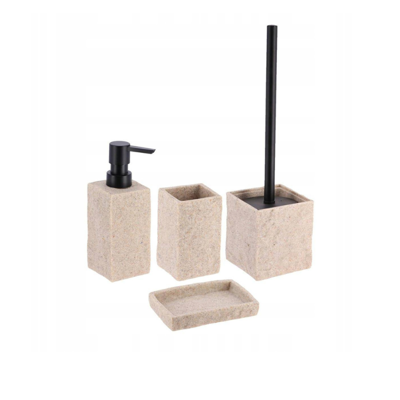 Visapusiškas sprendimas: rinkinys apima muilo dozatorių, puodelį, muilinę ir tualeto šepetį – viską, ko reikia kasdieniam naudojimui.